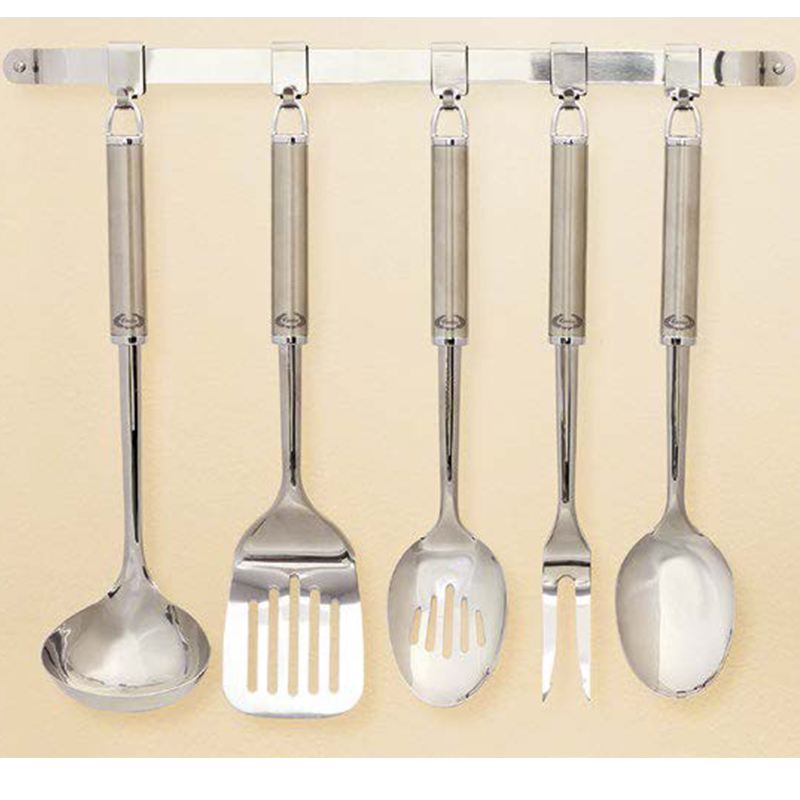 El juego consiste de cinco piezas esenciales: un cucharón, una cuchara coladera, una espátula, una cuchara, un tenedor trinchador y un colgador de acero inoxidable que mantiene estos utensilios indispensables para la cocina perfectamente ordenados y accesibles.
