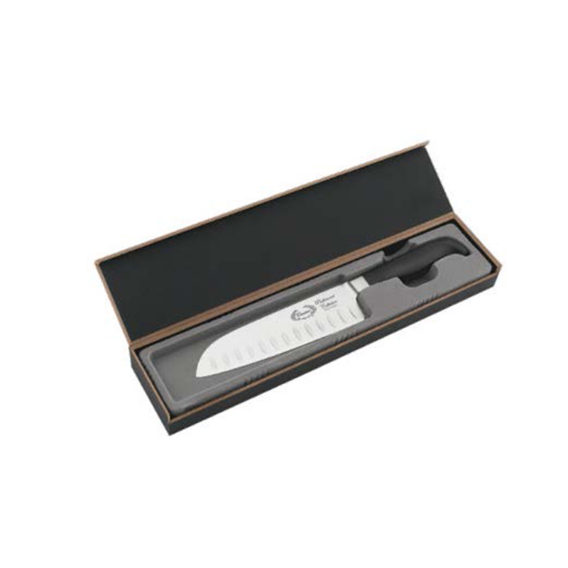 Este cuchillo clásico de siete pulgadas para usos múltiples está diseñado para cortar, picar y tajar. Sus hendiduras previenen que la comida se pegue al cuchillo.