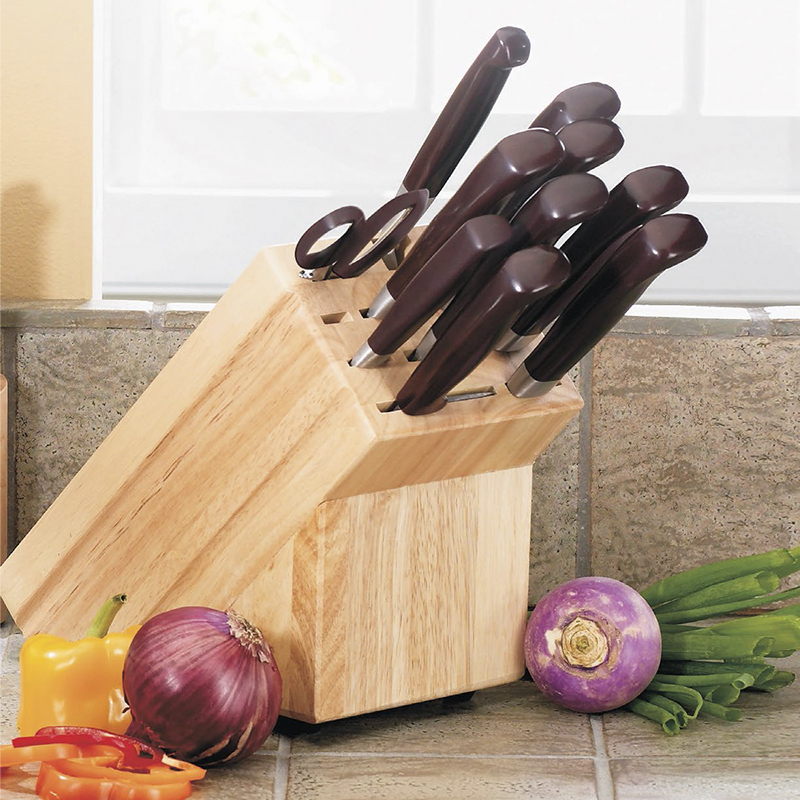 El juego incluye: Un juego Gourmet de 4 piezas, un juego Trinchador de 3 piezas, Tijeras y un bloque para colocar 8 cuchillos.